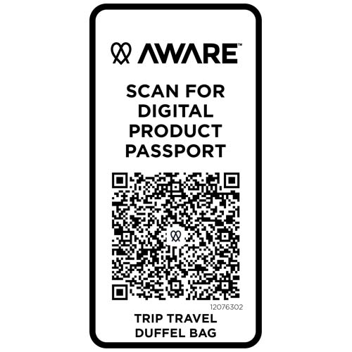The Trip Aware™ recycled travel duffel bag is a versatile and spacious companion, ideal for short getaways and carrying all your essentials with ease. Made from durable 290D twill polyester with a soft knitted backing and lined with RPET 210D/PU, it is designed for practical use and comfort. The main compartment includes a large zipped pocket with dedicated storage for a passport, pens, and a key ribbon, along with two internal slide pockets and dual water bottle holders. A separate bottom compartment opens in a clamshell style, perfect for storing shoes or separating gear. Each bag also comes with an Aware™ tracer. This innovative feature allows users to trace the origins and journey of their item through a QR code, enhancing transparency in the supply chain and fostering a stronger connection between the product and its production process. Volume capacity: 42 litres.