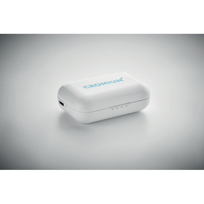 Set of 2 True Wireless Stereo (TWS) 5.3 earbuds with microphone 30 mAh battery built-in. Playing time approx. 3 hours. Auto-pairing. Including a micro USB charging cable and a 185 mAh charging station. Made from recycled ABS.