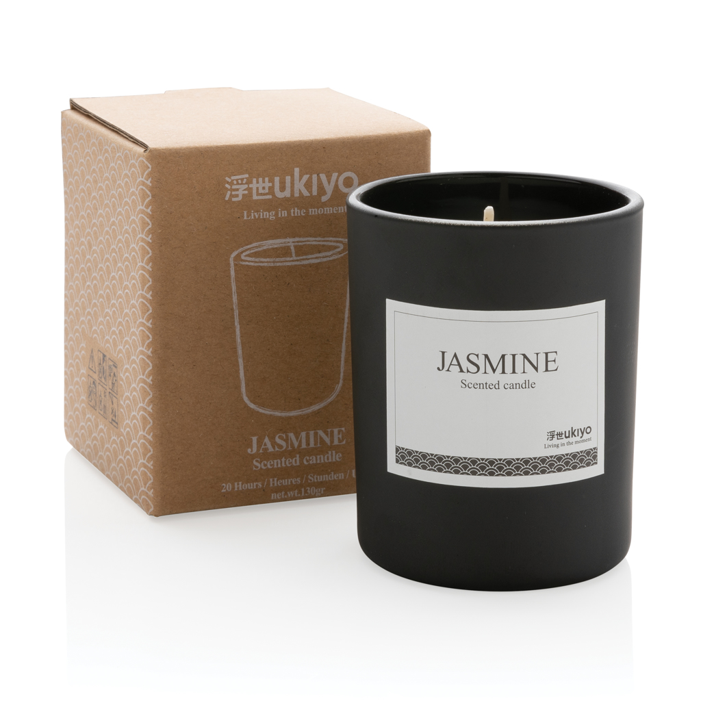 Create warmth and cosiness in your home with this Ukiyo small scented candle. Enjoy the subtle jasmin scent that is released. The scented candle comes in an elegant jar. Perfect for some extra athmosphere!