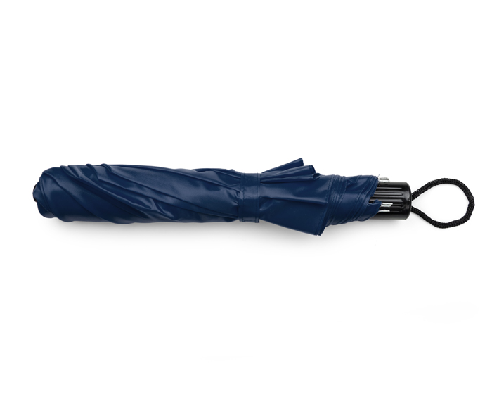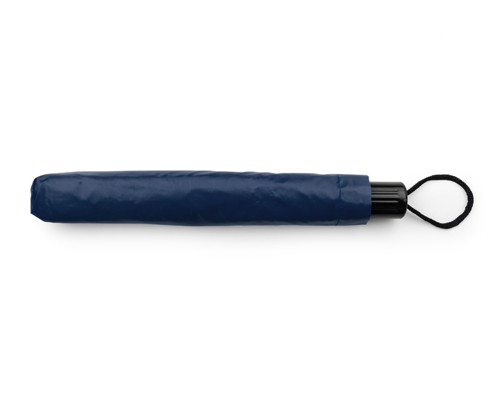 Folded, manual umbrella with a pouch and a handle-strap.Polyester 190T.