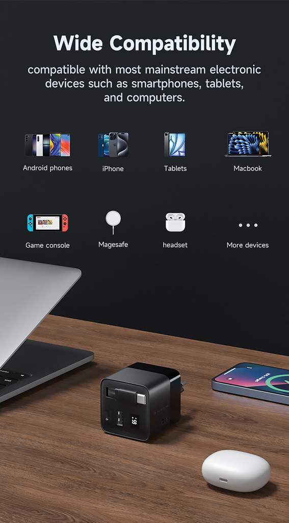 Meet the smartest 65W charger with a cable that’s always there when you need it. Mendocino is a 65W PD GaN charger that features a built-in 80cm retractable USB-C cable — so you can charge without ever reaching for a separate cable. It also comes with interchangeable EU and UK plugs, making it the perfect travel companion.GaN is a next-gen charging technology that allows for a more compact size, less heat, and greater energy efficiency. Mendocino charges all your devices at full speed, including laptops, tablets, and phones — and it can power up to three devices at once thanks to its additional USB-C ports and USB-A output. Mendocino is made with RCS (Recycled Claim Standard) certified recycled fireproof PC. Total recycled content: 18% based on total item weight. Urban Vitamin items are made without PVC and packed in plastic reduced packaging.