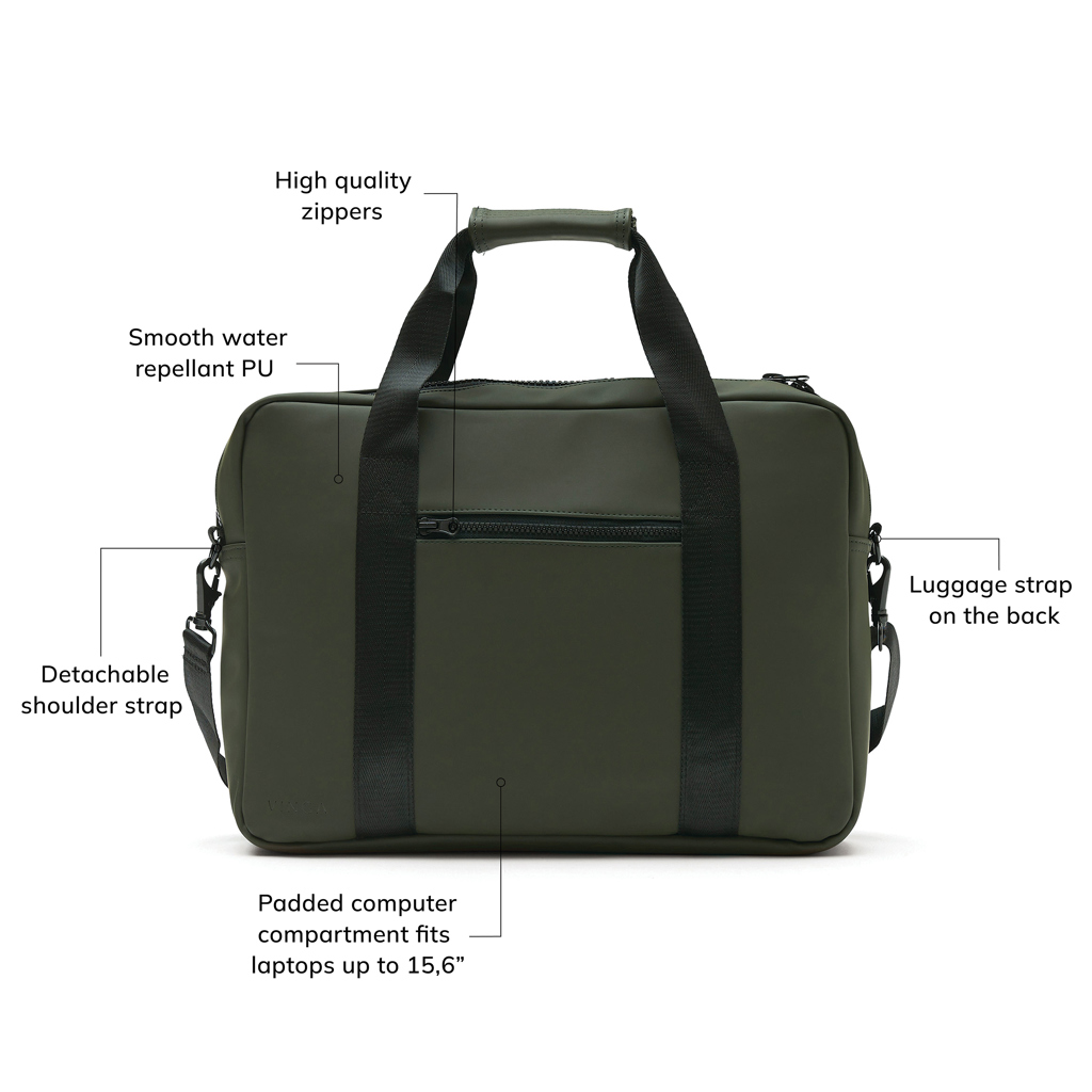 Modern and clean design computerbag. Functions and form comes together, besides the ordinary computer pocket this bag also has place for pens, documents and other belongings. The bag is produced in a water repellent material, with both shoulder strap and carry handles. It also includes an attached band on the backside, so it fits your trolley when travelling.Suitable for computers with an overall size of 17 inches. Please note that the dimensions of the display are not the same as the dimensions of the entire computer.