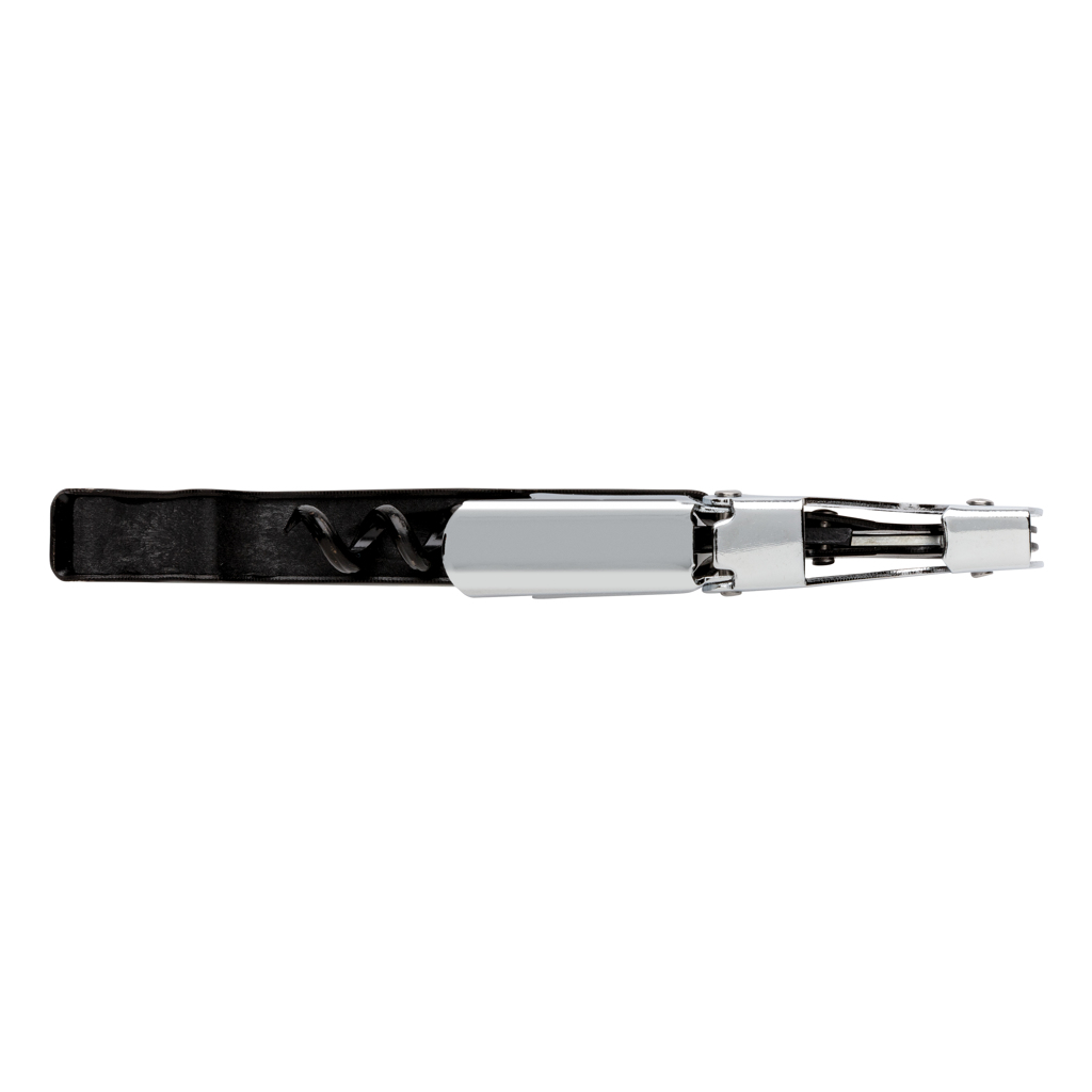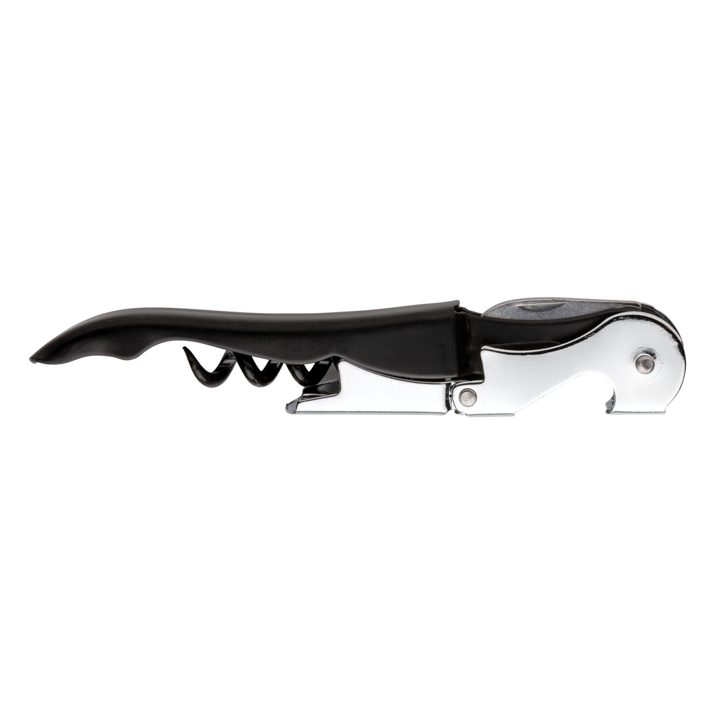 This waiters corkscrew is a classic corkscrew design that has a foil cutter blade, a two stage cork lifter and bottle opener. Packed in gift box.