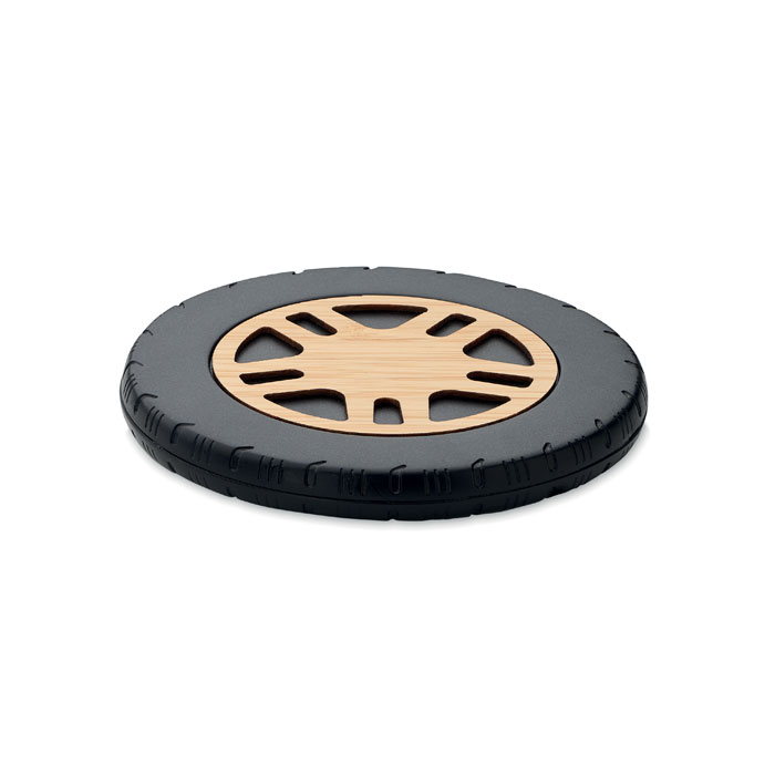 Wireless charger 15W in recycled ABS and bamboo top. Car tire design. Connect device to your computer, place smartphone on it and let it charge. Output: DC 9V/1.10A (15W) for quick charging. Compatible with all QI enabled devices such as latest Androids, iPhone® 8, X and newer.