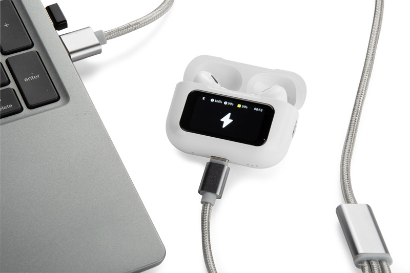 SENSIFY wireless headphones with a modern premium gadget that combines the functionality of in-ear headphones with an advanced case equipped with a colour touchscreen display. It allows you to control the volume, activate noise cancellation (ANC/ENC), switch to ambient sound mode (ambient) and view the charge level. The headphones provide up to 4 hours of operation and the 300 mAh case allows for multiple charging. The device connects to a smartphone via Bluetooth and supports touch control. The product is packaged in an aesthetically pleasing, minimalist premium style box. Charging is via USB-C (cable not included).