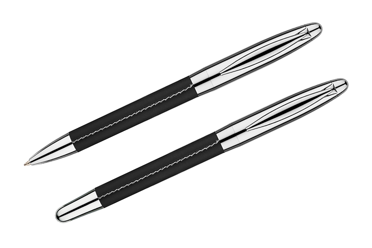 Writing set Elegance: ballpoint pen and ballpoint pen in a case made of leather-like material (PU). Ballpoint pen and rollerball pen with blue color refills. We will engrave your logo on the stationery.