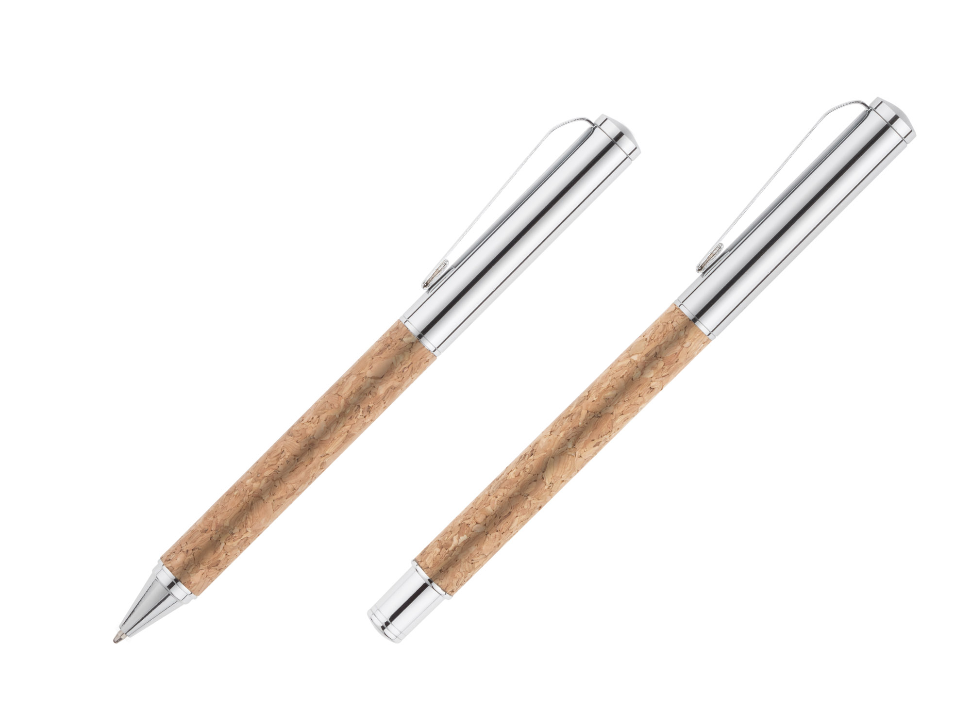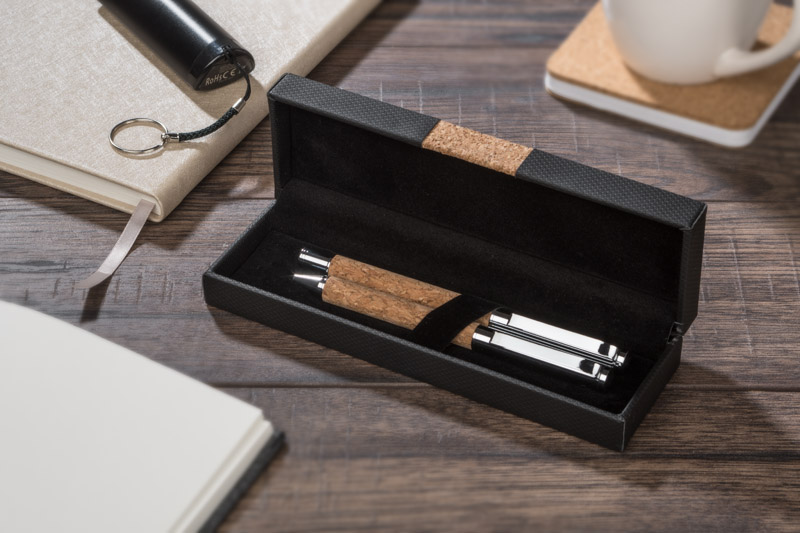 KANSAS is an elegant writing set for lovers of natural, environmentally friendly materials. The set includes a ball pen and rollerball pen made of metal and cork. An elegant black case is decorated with cork element. A pen with twist mechanism, with black refill, a ballpoint pen with stopper, with black refill.