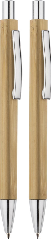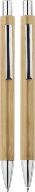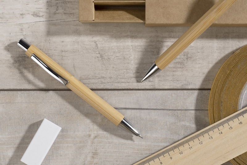 The MAMBOO writing set consists of a pen and an automatic pencil, packed in a brown eco-friendly cardboard box. The body of both pen and pencil is made of natural bamboo. Chrome finish gives it elegance. Blue pen refill, mechanical pencil 0.7 mm thick.