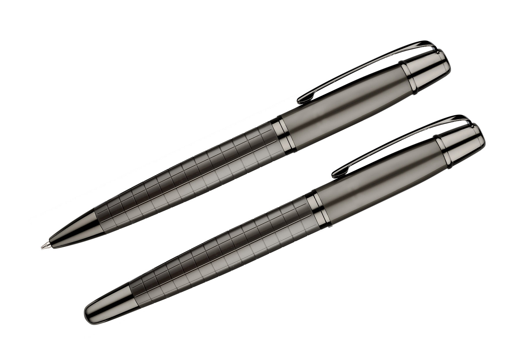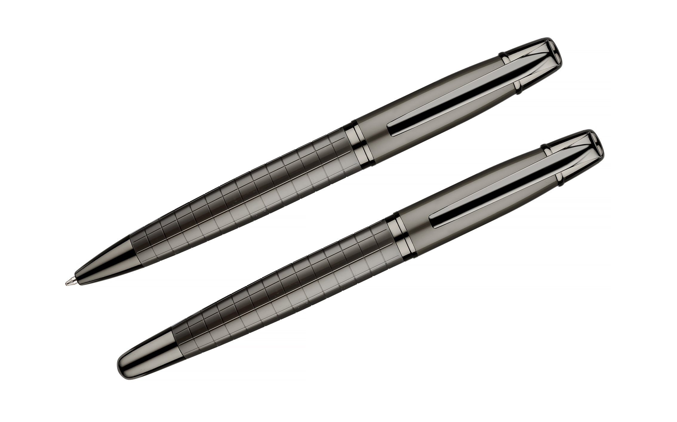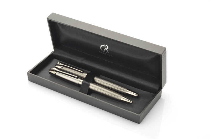 Elegant writing set of luxury brand GESSTOR that stand out with high quality and unique design. Black case contains ball pen and a roller pen. Both elements are made of metal with interesting texture and are marked with GESSTOR brand logo at the endings. Marking can be placed on ball pen, roller pen or on the case.
