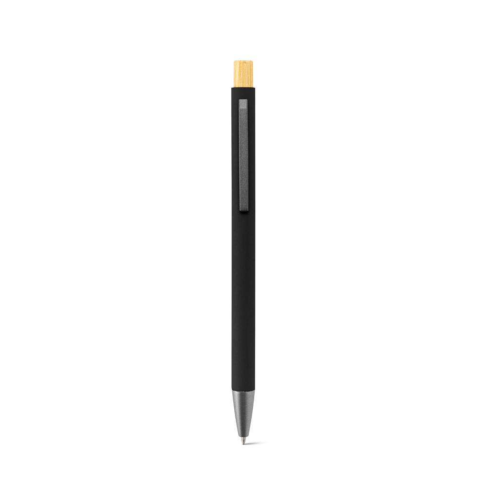 Recycled aluminum ballpoint pen (100% RAL) with a rubber finish. Its minimalist design combines matte metallic gray details and a bamboo button at the top. It features a clip and blue writing. When laser engraved, the personalization color will turn silver